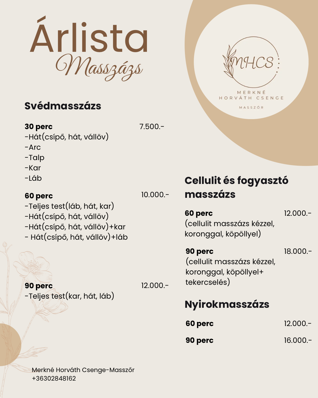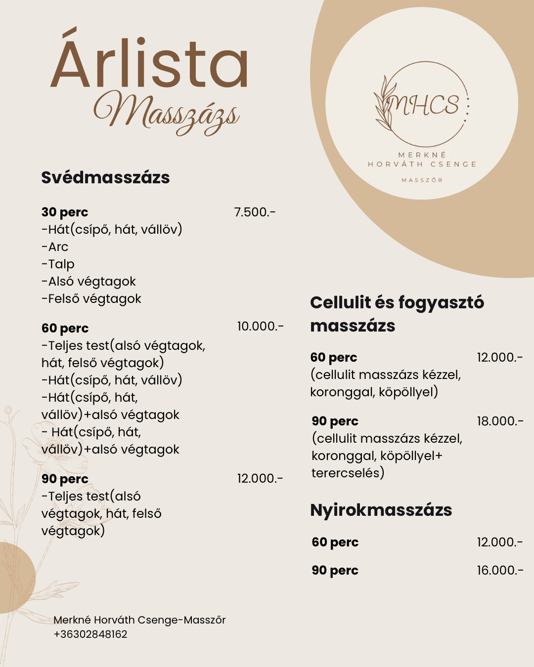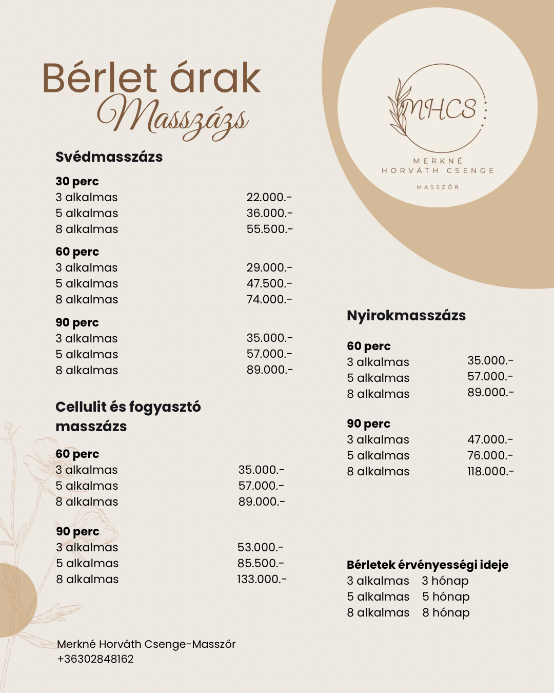 A megadott kategóriák irányadóak, telefonos egyeztetés alapján mindenkinek egyénre szabott masszázstervet alakítok ki!